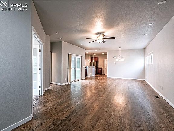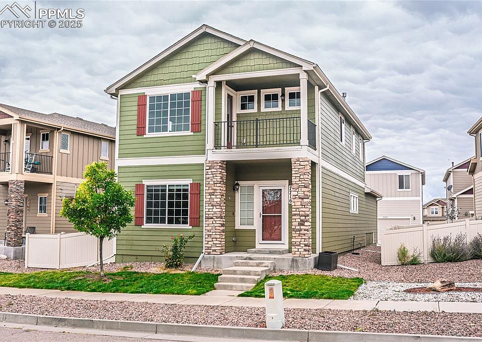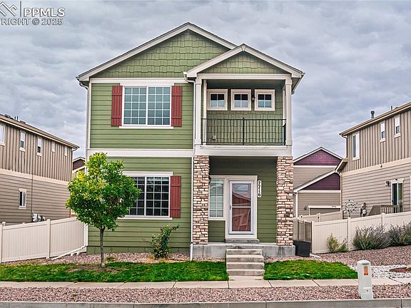 Welcome home to this beautiful two-story home nestled in the desirable Forest Meadows neighborhood. This charming residence boasts three bedrooms, three bathrooms, and a dedicated office, all complemented by an open concept floor plan flooded with natural light and beautiful site-finished hardwood floors on the main level. The stunning kitchen is perfect for entertaining, featuring quartz countertops, shaker-style cabinetry, and stainless steel appliances, including a gas range. Step outside from the dining area to your private, fully fenced yard with a sprinkler system. Upstairs, the impressive master suite features vaulted ceilings, a large walk-in closet, and a private covered patio deck—ideal for enjoying a sunset or morning coffee. Additional highlights include a two-car attached garage, central air conditioning, and a huge unfinished basement ready for your personal touch. Its location is exceptionally convenient, situated within a short 20-minute drive to both Fort Carson and Peterson Space Force Base, and mere minutes from the vibrant Powers Corridor, offering easy access to a vast array of shopping, dining, and entertainment options, as well as parks, schools, and medical facilities.