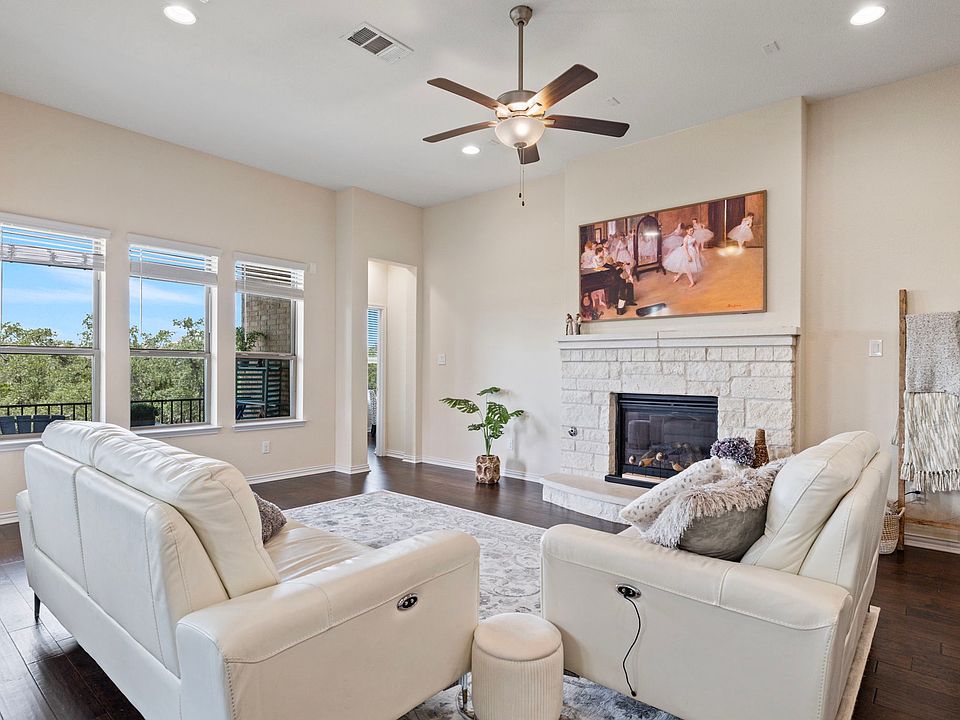 This elegant 4-bedroom, 3-bathroom home with a dedicated office is located in the prestigious Lakeside at Tessera on Lake Travis community in Lago Vista. Offering spacious living, modern upgrades, and tranquil distant views of Lake Travis, it's the perfect place to call home.