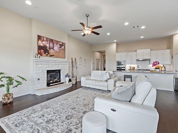 Outdoor living is a standout, with a covered patio and gas provision for backyard grilling, surrounded by peaceful Hill Country scenery and distant lake views. An attached 2-car garage completes the home with ample parking and storage.