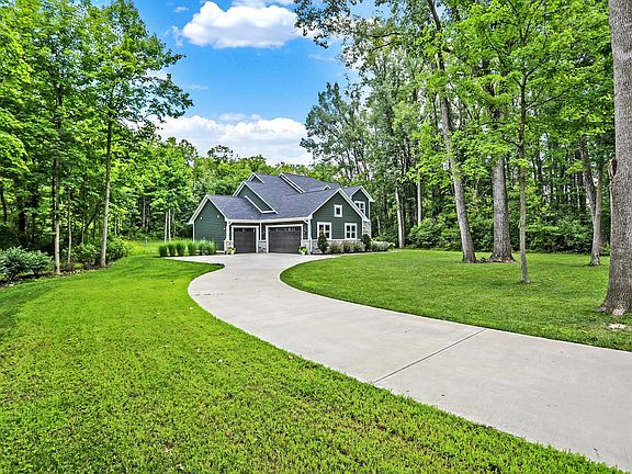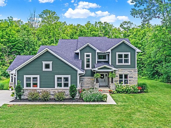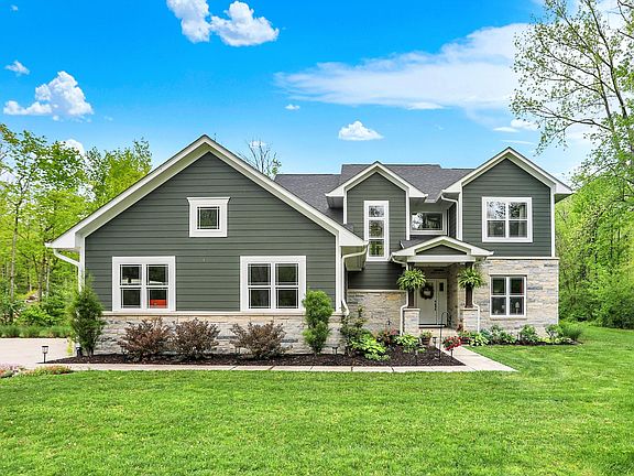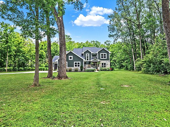 Welcome to this stunning Traders Hollow 2020 custom built residence, where modern luxury meets a warm, inviting atmosphere. Situated on a sprawling 1.65-acre lot, the home greets you with a spacious covered front porch and a long driveway leading to a finished 3-car attached garage. Inside, the foyer opens into a two-story great room anchored by a stone fireplace, perfect for cozy gatherings with family and friends. Sunlight pours in through large windows highlighting the gleaming engineered hardwood floors throughout the main, and the open-concept flow leads to a custom chef's kitchen with rich dark cabinetry, quartz countertops, premium stainless steel appliances (including a built-in oven, microwave, and wine fridge), and a pantry. The kitchen seamlessly flows into the dining area and great room, both offering serene views of the backyard and woods beyond. The main floor also includes a luxurious primary bedroom suite, complete with a spa-like ensuite bathroom featuring a double sink vanity, a relaxing soaking tub, a large tiled shower, and a generous walk-in closet. Completing the main level is a private office/den. Upstairs, three additional bedrooms, a conveniently located laundry room, and two full bathrooms provide ample space for family or guests. The finished basement adds even more living space, featuring a large family room with a wet bar (complete with bar-top seating and a bar fridge), plus an extra bedroom and a full bath. Outside, a concrete patio overlooks lush green space and mature trees, creating a tranquil setting for outdoor gatherings and summer barbecues.