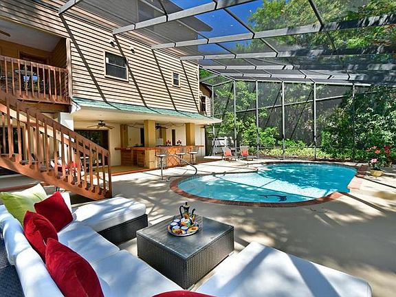 AMAZING VALUE FOUND HERE WITH THIS PRICE REDUCTION! Lush and private setting in this desirable Palma Sola Bay community. Over 1/2 acre with mature and native landscaping. Just a short stroll to Palma Sola Blvd. Large, two story screened enclosed pool area sits alongside a pond with relaxing fountain. Perfect home for entertaining with large dining area and kitchen bar counter opening to a great room with wood burning fireplace. Plenty of deck space surrounding freeform pool provides for several seating areas. Separate living level for family and guests and multiple AC zones for efficiency. Large, side load garage has ample storage space. Roof replaced in 2012. This truly is a unique property located in the heart of west Bradenton. Must see to truly appreciate all that this home has to offer!