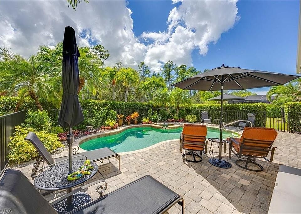 The most pristine home in Naples! This spectacular three-bedroom plus den, 2.5-bath pool home features an incredible private backyard filled with lush landscaping, and a tropical oasis. In Firano at Naples, just five miles from historic 5th Avenue, you’ll enjoy world-class shopping, dining and the famous sugar-sand beaches. Not in a flood zone, this residence welcomes you with a grand gated entry and soaring ceilings that enhance its open, light-filled design. The oversized living and dining areas flow seamlessly into the leisure room, creating an ideal layout for everyday living and entertaining. With easy one-level living, you’ll find no stairs and no carpet. Impact-resistant windows and doors, plus a whole-house generator, provide peace of mind. The gourmet kitchen offers granite countertops, white cabinetry, a pantry, and LG stainless appliances, opening to a cozy family room with serene green tones and views of the tropical backyard. Go outside to the screened lanai with electric shutters and enjoy the sparkling pool/spa surrounded by lush gardens—a gardener’s paradise. The spacious primary suite boasts dual vanities, a luxurious jetted tub and spa-like comfort. Two beautifully decorated guest bedrooms with a shared bath, plus a light-filled office/den with French glass doors and wood flooring, complete the interior. Community amenities include a clubhouse, resort-style pool and spa, fitness center and social room. Centrally near Interstate 75, downtown Naples, fine dining, shopping and world-class beaches, this home offers elegance and convenience.