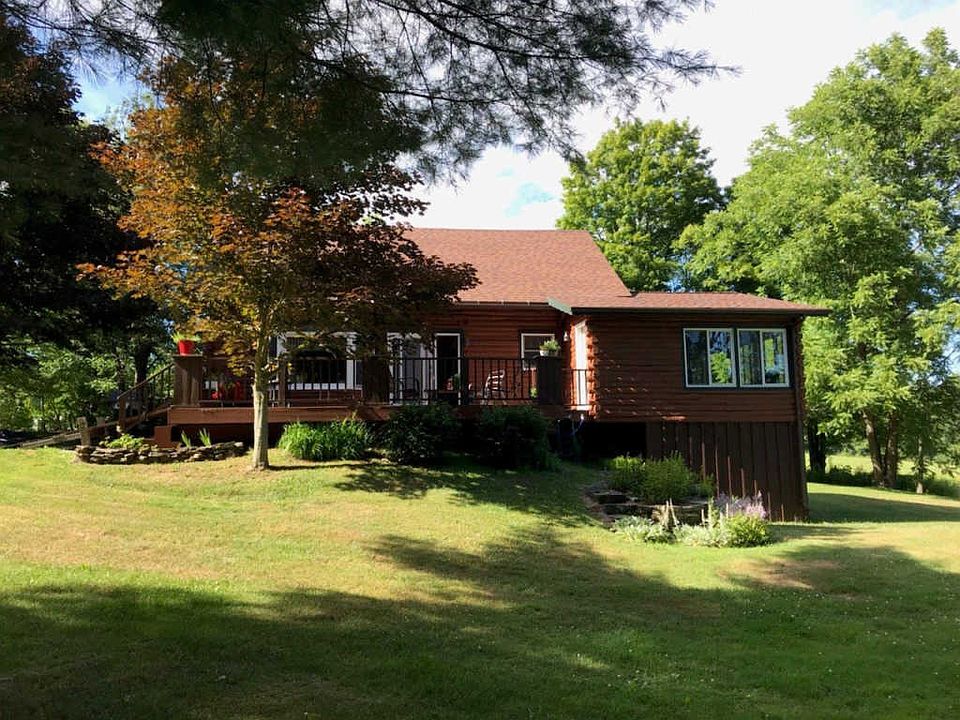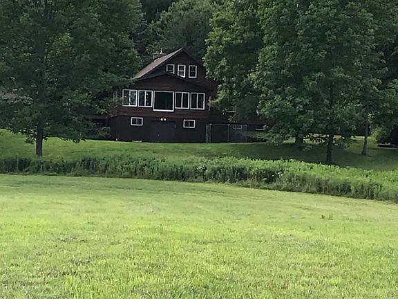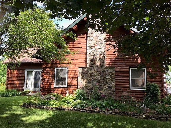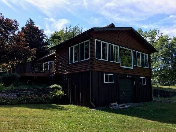 Meticulously maintained and tastefully updated two or three bedroom, one full bath log home situated on 2.0 scenic acres. The first floor features an open layout living space with easy working kitchen and eat-in breakfast island open to large living room with Cathedral ceilings and beautiful stone hearth and woodstove. Large first floor master suite for single level living option. First floor is rounded out by awesome window filled addition with hardwood flooring and panoramic views of the countryside. Second floor features one bedroom with open beam ceiling. Basement highlighted by large finished space, ideally suited as third bedroom, office or rec room. Basement also offers laundry area, clean, dry storage, and walk-out to enclosed outdoor equipment garage and wood storage area with overhead door. Exterior highlighted by private deck, oversized detached one car garage, well manicured grounds, and great hillside views!