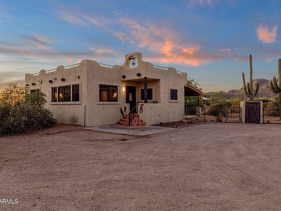 This home at 772 E Moon Vista in Apache Junction is a desert retreat with breathtaking views of the Superstition Mountains and stunning sunsets. Whether you're enjoying a morning coffee or an evening unwind, the panoramic vistas provide a picturesque backdrop. Built in 1991, the 1,032 sq ft main house features 2 bedrooms, 2 baths, and a family room. The star of the property is the impressive 1,815 sq ft RV garage, built in 2016, complete with a 200 sq ft guest house featuring a full bath. The garage also includes a loft for additional storage, perfect for adventurers needing space for their gear, all set on 1.25 acres with stunning desert views.