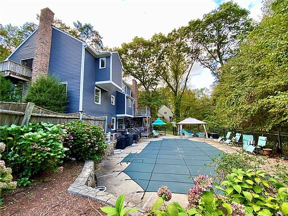 Large 4 bed, 2.5 bath colonial nestled in the woods of North Smithfield. Newer composite exterior, large yard, and fenced-in in-ground pool. Large eat-in kitchen with stainless steel appliances, skylights, and full slider walkout to upper deck. Formal dining room with hardwood floors. Dual living rooms on first floor, each with its own fireplace and hardwood floors. First floor half bath and laundry. Primary bedroom with private deck and private full bath with jacuzzi tub and skylights. Second floor has additional full bath as well. Partially-finished basement with full slider walkout to lower deck and in-ground pool. Less than 1 mile to Route 146.