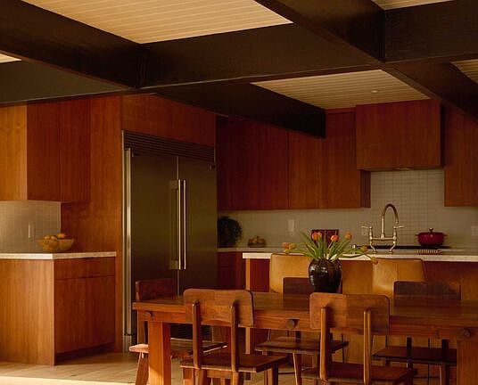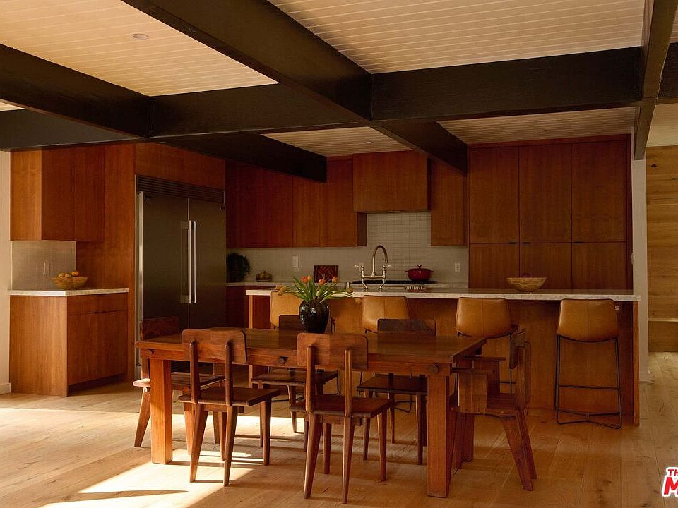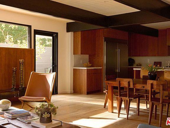 On a quiet cul-de-sac in the Hollywood Hills, this celebrity-owned reimagined 3 bedroom, 3.5 bath mid-century home offers a deep connection to its natural surroundings. Intimate, yet open and inviting, this home brims with natural light, framed by views of the canyons beyond. The main level features a warm open plan chef's kitchen with a generous island and seamless sightlines to the outdoor patio, firepit, pool, and treetop views. A large fireplace anchors the living room, where expansive windows invite sunshine throughout the day, allowing for constant dialogue between indoors and out. Two bedrooms with a shared bath, a powder room, and a cozy nook complete the first floor. Upstairs, dramatic skylights illuminate a den with floor-to-ceiling bookshelves and ample space to relax. Just across the hall lies the primary suite, private and serene, with a fireplace, a walk-in closet, and a large bathroom with a soaking tub and separate shower. An attached two-car garage allows for easy access and security. A perfect balance of mid-century modern details matched with contemporary comforts within a peaceful hillside setting make this an inviting retreat that captures the quiet, timeless spirit of the Hollywood Hills.
