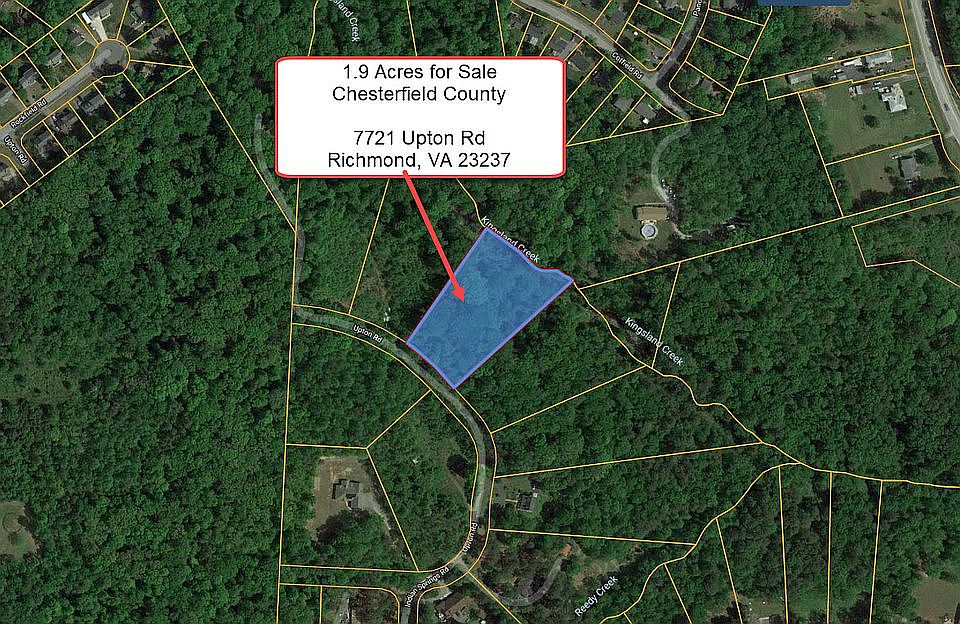 This 1.90-acre lot in Chesterfield County, Virginia is an incredible offer that won’t last. Tax assessed value is $63,200. The property was recently perc tested and is suitable for a 4 bedroom septic system. Nestled in Reedy Ranch just off Upton Road, the area has ample trees and the rear of the property backs up to a creek. Within a few miles are shops, stores, restaurants and other major establishments for your convenience. Drive up to downtown Richmond, just 13.9 miles north. For starters, get to know Richmond’s outdoors. This region is a great big outdoor playground. Whether you want to take a slow bike ride by the river down the Virginia Capital Trail, or take on the class 3 and 4 rapids of the James (which go right through downtown, by the way) – the Richmond region will get your heart pumping. What are you waiting for? Call us now to learn more of this offer! EQUAL HOUSING OPPORTUNITY. This is a contract for sale for an assignment fee.