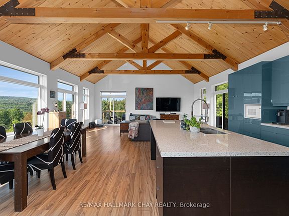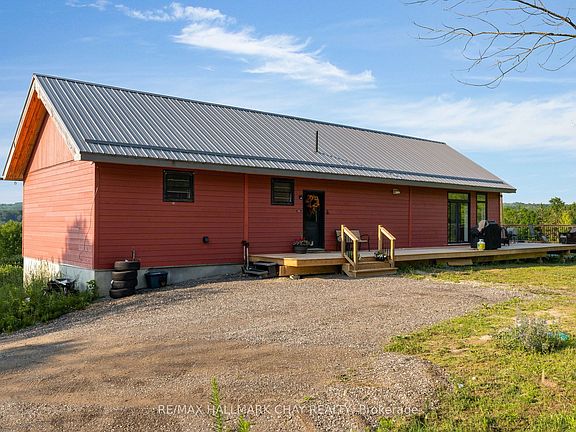 Welcome to an extraordinary opportunity just moments from the charming village of Creemore's downtown. Set on 30 picturesque acres with sweeping Southern views toward the Hills of Mulmur, this one-of-a-kind property offers a blend of tranquility, sustainability, and untapped potential. With nearly 10 acres zoned Residential Hamlet, future development possibilities make this a rare investment in one of Ontario's most sought-after rural communities. Built in 2019, the thoughtfully designed 2-bedroom, 3-bathroom home combines modern efficiency with country charm. The home features in-floor heating, off-grid solar, an ICF foundation, tankless water heater/boiler, UV water treatment, and a water softener, ensuring year-round comfort and self-sufficiency. Open concept living flows throughout the main level, while the unfinished walk-out basement offers over 1600 square feet of incredible potential to expand your living space. The primary suite includes a walk-in shower and serene views, while the second bedroom includes additional loft living space. The main floor laundry adds everyday convenience. The insulated double car garage, also outfitted with in-floor heating, is easily convertible into a guest suite, studio, or additional living quarters. Enjoy mornings on the wraparound porch, soaking in the surrounding countryside and unmatched privacy. Whether you're looking for a peaceful retreat, a multigenerational living option, or a strategic long-term investment, this unique property delivers. Opportunities like this are exceptionally rare. Book your private tour today!