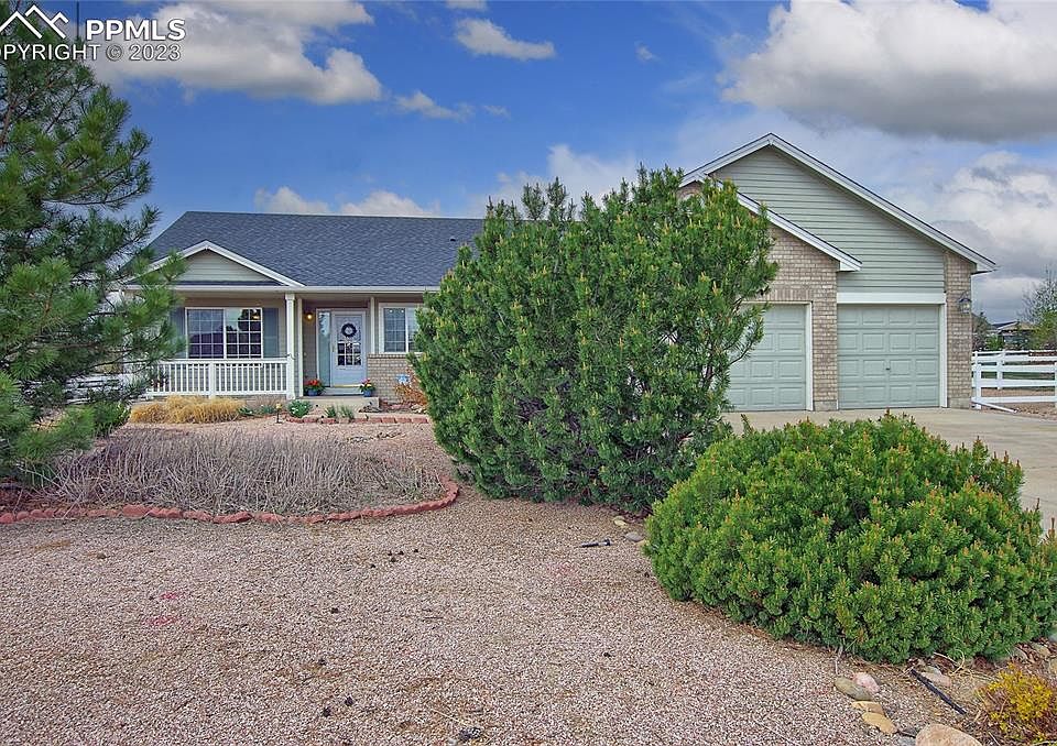You must see this spacious & open ranch-style home with a 2000 sq ft main level plus room to expand in the unfinished basement! Enjoy the elbow room of a half-acre site complete with extensive water-efficient xeriscaping. Reroofing was done in 2020 and the water heater replaced in 2018. Ceiling fans and central A/C contribute to year-round comfort. Relax on the covered front porch and watch the sunrise. The eat-in kitchen features extended counters, a generous number of cabinets, an island, double ovens and a pantry closet. A very large family room feels even roomier because of the high valuted ceiling. Conveniently located on the main level, the laundry room has a counter for folding, shelving for supplies and a clothes-hanging rod. Roughed-in basement plumbing is in place for a future 4th bathroom and storage space certainly abounds! Walk out from the breakfast nook to a walled 20x10 patio and an area set up for a hot tub. There ia also a pergola in the fenced back yard. Antler Creek Golf Course and Falcon Regional Park are nearby. Note the ease of commuting to Schriever & Peterson Space Force Bases .