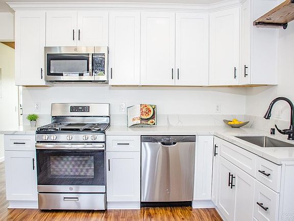Welcome to this remodeled single story home, this beautiful 3 bed/2 ba with office offers a custom wood door with your own mail slot, natural light throughout, striking wood beamed ceilings, picture windows, modern farmhouse kitchen with stainless steel appliances, white shaker cabinets, quartz countertops and wide vinyl plank flooring. You will have plenty of space in your large master ensuite with its own wood burning fireplace and large backyard, come and make this home yours.