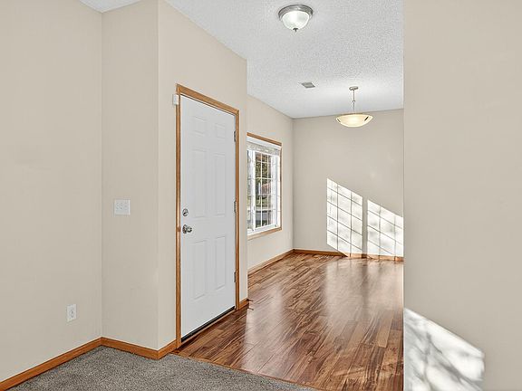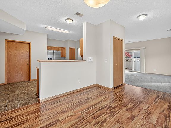 Discover single-level living in this sunny and immaculate end-unit townhome. Kitchen features stainless steel appliances, ample counter space and a breakfast bar for casual dining. Relax by the cozy gas fireplace or step outside through the walkout door to your private patio, perfect for morning coffee. The primary bedroom features a large walk-in closet and a private 3/4 bath. The ensuite bath offers a double vanity and modern LVP flooring. The second bedroom or office has a large double closet, offering plenty of storage. A second full bath is great for guests. The laundry room w/ in-unit washer/dryer is conveniently located off the attached garage entry, and also provides space for mudroom storage. A two-car garage with built-in shelving and an expansive driveway ensures parking for you and your guests. This townhome is move-in ready - single level living in a convenient location - welcome home!