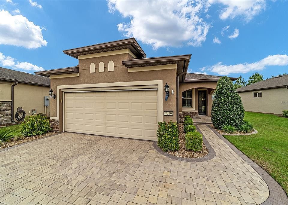 Welcome to your spacious retreat in the heart of Stone Creek. This beautifully expanded Taft Street model offers an abundance of upgrades and thoughtful additions, making it the perfect blend of comfort and elegance. Really this home has every upgrade! When you drive up you will notice the expanded brick paver driveway and stone accents. As you enter the home you are greeted by tall ceilings, crown molding, plantation shutters, and engineered hardwood flooring. The floor plan was modified in this home. The Lanai was built as additional living space (den with built-in bookcase) and a covered screened lanai with brick pavers was added, offering a serene outdoor space to relax, entertain, or dine alfresco while enjoying the Florida breeze. Both the master and guest bathrooms have been updated with tiled showers and flooring providing a spa-like experience in the comfort of your own home. Barn doors have been added to the master bath entrance. The kitchen has large island upgraded appliances and tiled backsplash and upgraded shelving in pantry. There is also a solar tube in kitchen and hallway. The garage is equipped with an automatic screen door, ensuring convenience and functionality and epoxy floor for added durability and aesthetic appeal. For added storage there are 2 overhead storage racks in the garage that provide ample space to keep your belongings. All of this and you will love the amenities at Stone Creek. The new clubhouse has a bar, simulated golf, 6 pool tables and dart board room, outdoor games and a view of the lake! There is a sauna, hot tub, indoor pool and outdoor resort style pool, pickle ball raised bed gardening area and a catch and release pond. Golf cart is available to purchase separately from the home. NO FENCES ALLOWED IN GARDEN SERIES HOMES.