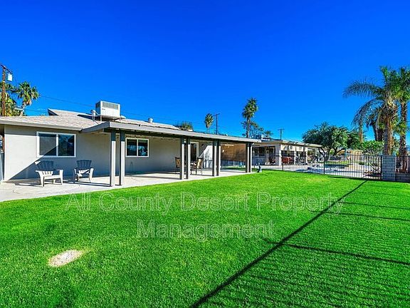 This stunning home offers breathtaking panoramic views of the Santa Rosa Mountains. Step inside to discover a spacious open floor plan that seamlessly connects the living, dining, and kitchen areas, creating an inviting space for relaxation and entertainment. With three bedrooms and two bathrooms, the home is a peaceful retreat at the end of the day. The two guest bedrooms boast south-facing views of the mountains. The versatile layout also provides the option for one guest bedroom and an office. The kitchen is a chef's delight, equipped with modern appliances, ample counter space, and a breakfast bar for casual dining. Dual pane windows throughout the home contribute to energy efficiency, keeping you comfortable year-round. As you step outside, you'll be greeted by a large fenced backyard with a lush lawn, ideal for hosting gatherings or simply basking in the serene surroundings. The outdoor space overlooks the fairway of the golf course, offering a picturesque backdrop for your daily enjoyment. Golf Cart Parking as well! Centrally located, this home allows for quick access to restaurants, shopping, theaters, and outdoor activities such as hiking and biking. Whether you're seeking a peaceful retreat or an active lifestyle, this home caters to your every desire. Tenant to pay all utilities. Don't miss out schedule your showing today!