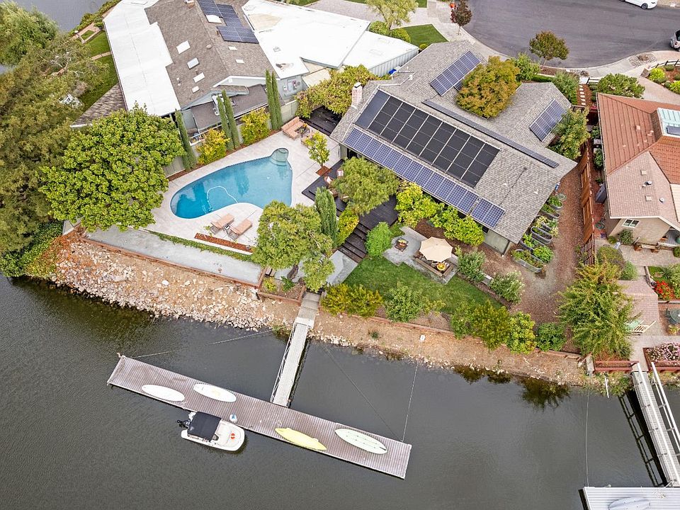 Abundance and Style define this custom single-level residence on .37 acre of Waterfront. Consummate Napa Valley living is easy as vast entertaining spaces flow seamlessly indoors and out. Life centers on a Great Room with wood-burning fireplace and views across a placid Pool onto Western light reflected on the River. All of this is set amidst a professional landscape designed for outdoor cooking, dining and farm-to-table culinary pleasure. The 70' dock on 264' of riverfront tempts you to relax on the friendly water in anticipation of a memorable evening, or play Bocce as the sun sets. Just as a Stainless and Gas open Kitchen with Carrara Marble surfaces will inspire any Chef, the Office/Media and Sleeping Rooms are a retreat apart from social and lounging spaces. Luxe Baths, Closets, and Storage assure serenity and respite from an active lifestyle. Rebuilt in 2016, conceived for sanctuary and wellness, every corner of this beautifully realized home offers comfort. From the Entry Courtyard to the huge Pergola laden with Winegrapes, across expansive IPE Decking to the Spa, and plantings on all four sides yielding Fruits, Vegetables and Herbs, this lush abode truly will feed your passion for living well. Solar, EV Charger, Light, Sound and Security systems simply enhance the luxury.
