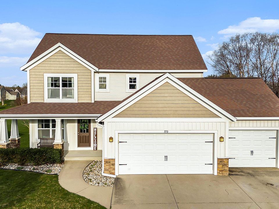 This custom-built home by Bauman Builders in Zeeland school district features a traditional two-story design with a welcoming spacious front porch, perfect for enjoying neighborhood views. Upon entering, you're greeted by a versatile space that can serve as a large living room or a combined living and music area. The open-concept layout on the main level seamlessly connects the living room, dining area, and kitchen, enhancing the flow and making it ideal for entertaining. This level also includes convenient half-bath/powder room & mudroom with built in bench. A walk-in pantry and kitchen island provide added convenience. Dining room sliders open to the deck, which leads down to a backyard patio & separate basketball court. The upper level houses a spacious primary suite complete with an en-suite bathroom featuring dual sink vanity, a walk-in closet, and shower. Three additional bedrooms and a second full bathroom with 2 separate sink vanities complete the upper level. The lower level is designed for entertainment with two gathering areas: a TV room with sliders to the backyard and a large recreation room currently set up with a pool table and a bar area. The wall bar features a live edge walnut shelf, floating shelves above the bar cabinet, and a mini fridge. Pool table to remain for seller convenience. Plumbing is already in place for a potential future full bathroom. 2 zoned heating system on main and upper w/separate humidifier dampers. A three stall garage and an underground sprinkling system covering the full front yard and part of the backyard round out the features of this magnificent home. Association Dues include maintenance of lights landscape berm, signs and association bridge to wooded area and walkway. Seller reserves the right to set a deadline. Buyer and buyer's agents to verify all information. Seller and listing broker/listing agent make no warranty or guarantees. No buyer letters will be reviewed