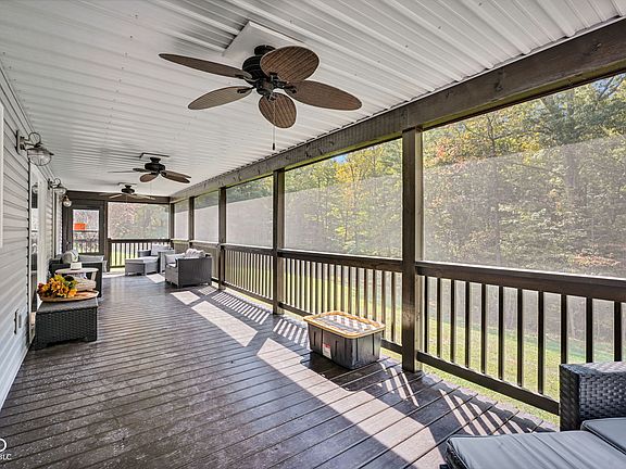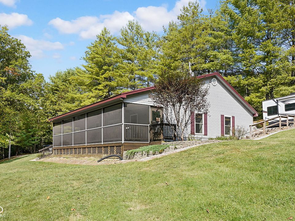 Feast your eyes on 7730 State Rd 46 E, in Nashville, Indiana, a single-family residence sitting pretty, prepare to be charmed! The living room is magic, with a beamed ceiling and a vaulted ceiling conspiring to create a space that feels both grand and cozy all at once. Imagine sinking into a comfy chair in your sunroom, the warm light streaming in as you contemplate the important questions in life, such as, "Should I have another cup of coffee?" The kitchen is ready for your culinary adventures, with a large kitchen island with granite countertops, offering plenty of room to chop, dice, and create your signature dishes, or simply to display your impressive collection of artisanal cheeses. The primary bathroom features a double vanity, so there's no need to fight for mirror space in the morning! With a sprawling 2-acre lot area and a delightful woods view, this property offers an abundance of outdoor living space, creating your very own private sanctuary. The open floor plan creates an airy, welcoming atmosphere, while the laundry room and walk-in closet add a touch of practicality to this attractive property. Did I forget to mention the heated floors....through the Whole house. There's also a tankless water heater for quick showers and laundry and the roomy 2 car garage to store cars or toys out of the weather. One. More. Thing, there's an RV hook up for any extra guests that might want to stay.