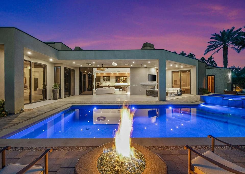 Exquisite Desert Modern Estate in Indian Wells Country ClubDiscover this stunning home built in 2023, offering 4,417 sq ft of luxurious living on a quiet 19,211 sq ft lot. Situated on a cul-de-sac within the prestigious gates of Indian Wells Country Club, this property feels like your private estate with breathtaking mountain views and captivating sunsets.Crafted with desert modern chic architecture, the residence features expansive sliders and large windows that flood the interior with natural light. Impeccable stonework and high-end finishes elevate the aesthetic, creating an atmosphere of timeless elegance.Step inside to a thoughtfully designed floor plan with 4 bedrooms, 4.5 bathrooms, a dedicated office, and a theater room perfect for relaxing or entertaining. The attached casita offers a full living space, large bedroom, and full bath--ideal for guests or multi-generational living.The gourmet kitchen is a culinary masterpiece, equipped with top-tier Subzero, Cove, and Wolf appliances, custom cabinetry, a butler's pantry, and an oversized island for gatherings. Outdoor living is equally impressive, featuring a spacious entertainment area, stunning mountain vistas, lush mature desert landscaping, and a beautiful courtyard. The sparkling saltwater pool and spa add a luxurious touch--perfect for relaxation and entertaining amidst breathtaking views.Enjoy the benefits of owner-owned solar, low HOA fees, and a large driveway leading to a grand entrance--combining sustainability, exclusivity, and impressive curb appeal. The property's extensive views, outdoor spaces, and elegant finishes create an ideal desert retreat.Furnished per inventory, this home exudes sophistication and comfort, offering a luxurious, modern desert sanctuary. Experience the perfect blend of privacy, elegance, and breathtaking scenery in this exceptional Indian Wells estate.