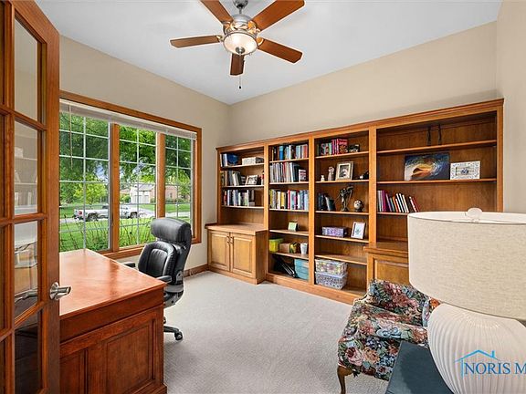Beautifully maintained custom home on nearly 2 wooded acres in Wrenwood! Welcoming foyer opens to formal dining & den/office w/ built-ins. Expansive great room fills w/ natural light, soaring ceilings, stone fireplace & scenic views. Kitchen offers Corian counters, tiled backsplash, eat-in area, under-cab lighting & wine cabinet. Main floor laundry. Primary suite boasts tray ceiling, WIC & ensuite. Walk-out lower level feat. theater room (equipment stays), kitchenette & patio w/ hot tub. Relax on the deck above overlooking wooded ravine; property extends to Swan Creek.