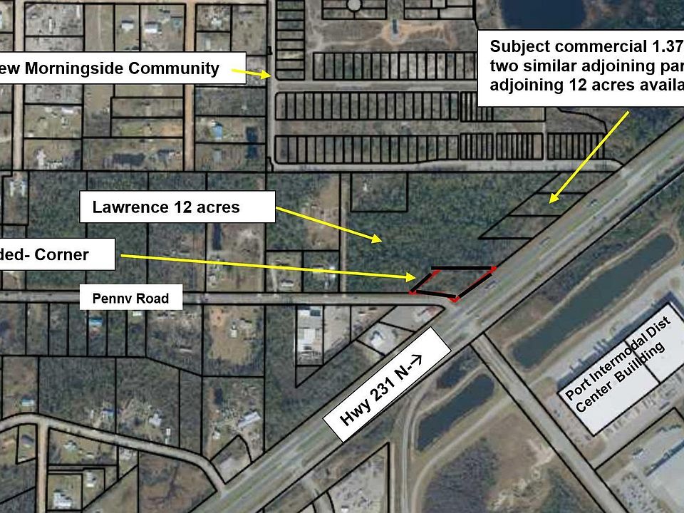 Remarks: Outstanding corner across from the intermodal distribution center on Hwy 231 at the corner of Morningside Drive, residential subdivision. Traffic County 27,500 AADT January 2020 and growing! This is one of three parcels of equal size adjoining, totaling 600 feet and 4.1 acres available until one of these parcels is sold. Owner has cleared, added fill to make the property shovel ready. County GIS shows elevation 55-60 feet above sea level. These parcels are not shown as a flood hazard area on FEMA maps. Exactly 10 miles from intersection of Hwy 231 and Hwy 77 in a rapidly growing area just north of Hwy 231 planned enhancement project.