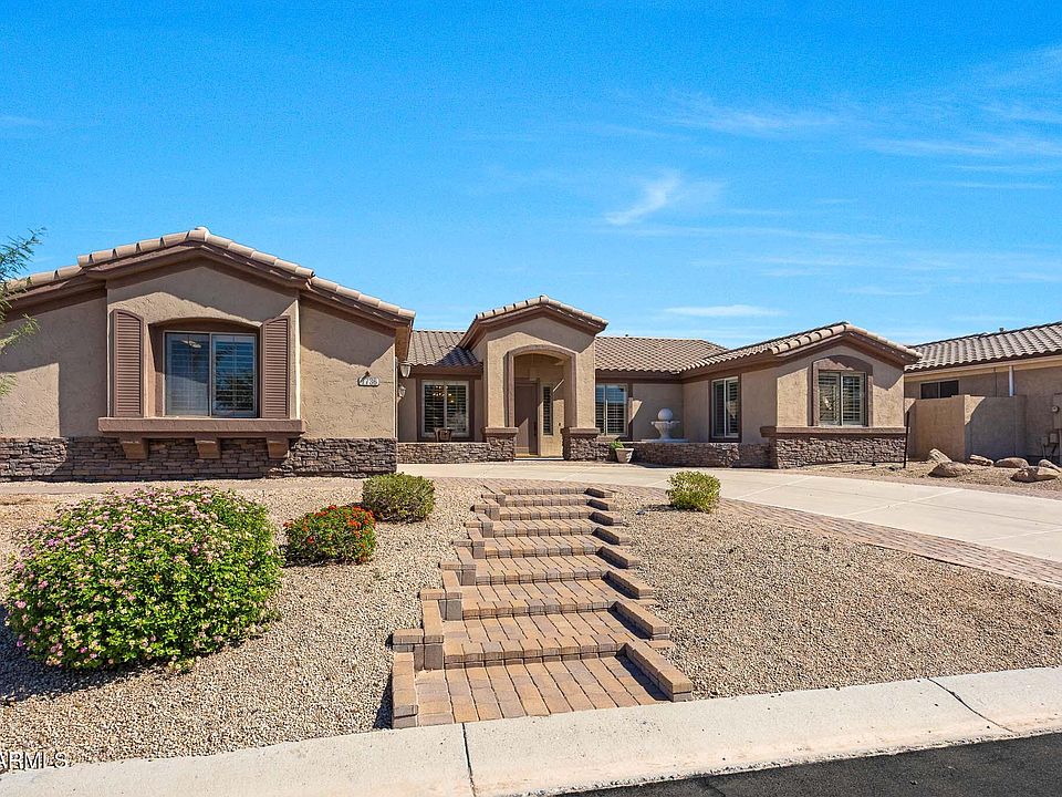 Discover the perfect blend of style and comfort in this beautifully updated home in the coveted and gated Sonoran Hills community of the Pinnacle Peak Area. Offering four bedrooms plus a den and office, three bathrooms, and 2,889 square feet, this residence is designed for everyday living. The open-concept great room showcases soaring ceilings, a cozy stacked-stone fireplace, and wide-plank tile flooring that flows seamlessly into the kitchen. The kitchen is a true centerpiece with white cabinetry, stainless steel appliances, double ovens, a gas cooktop, subway tile backsplash, granite counters, and a large island with bar seating. The breakfast area overlooks the backyard through plantation shutters, creating a light-filled and welcoming atmosphere. Other living spaces include a formal dining room and a private office off the entry. The den makes for a perfect flex space currently set up as a TV/game room. The split floor plan has the primary bedroom on one wing, another split bedroom located off the great room with an adjacent full bathroom. The other two guest bedrooms share a Jack and Jill bath. The large laundry has direct access from the garage, exterior access, laundry sink, and plenty of cabinet storage. The spa-like primary bathroom has been fully reimagined with a freestanding soaking tub, walk-in glass shower, and sleek vanity with designer finishes.