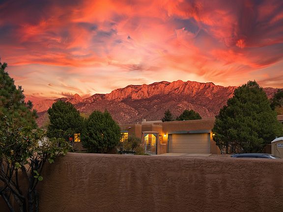 Single Story Santa Fe style Pueblo home with great pride of ownership at the base of the Sandias! This home has FULLY OWNED SOLAR! Interior features raised & exposed wooden beam ceilings, floor to ceiling Kiva fireplace, & Talavera tile in two lighted display nichos. Kitchen updates include ceramic tile floor, granite countertops,& SS appliances! Kitchen opens to the Family Room that offers outstanding views of the city lights! Private master complete w/ walk-in closet, full bath, & private access to the front courtyard w/ a picture perfect Sandia panorama. Revival city- TPO roof, bonus mini-split A/C & Heat, maple hardwood flooring, landscaping & more since 2018. East/West orientation provides brilliant natural light and perfect vistas of the mountains & city lights. DONT MISS OUT!