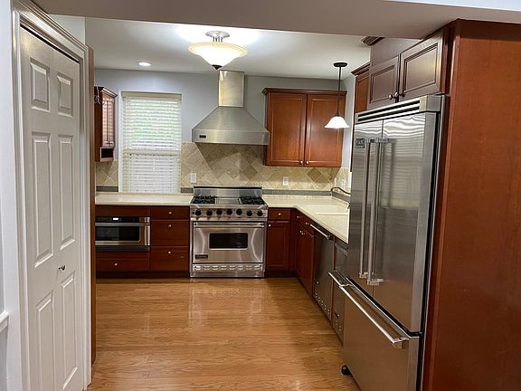 Stainless steel appliancesShiny wood floorsNew wine coolerGorgeous countertopsLarge windowsNeutral colorViking kitchen