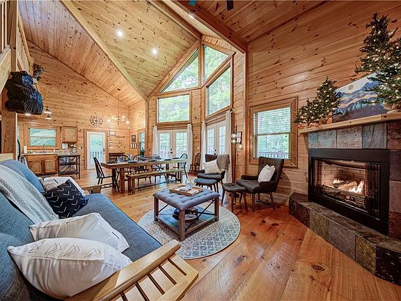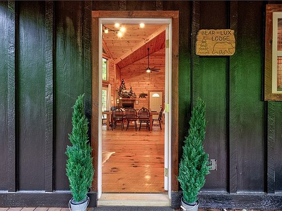 Escape to the mountains at BearLux Lodge, a beautifully furnished 3-story log-sided cabin tucked into 3.12 private wooded acres just minutes from historic downtown Blue Ridge. Designed for entertaining and relaxation, this spacious home accommodates large groups comfortably with multiple gathering areas, three full baths, and sleeping space for ten or more people. Inside, the home combines industrial-boho design with rustic warmth—featuring rich wood interiors, iron and mid-century accents, and an open layout across all three levels. The main level offers a welcoming great room with stone fireplace, large windows overlooking the forest, a modern kitchen with center island, and access to the wrap-around deck. The upper level includes a private loft bedroom suite plus an office area with dual-monitor workstation ideal for remote work or gaming. The terrace level adds a family-friendly bedroom with queen bunk and trundle, a recreation room with pool table and foosball, and direct patio access. Outdoor living is equally impressive—relax in the open-air hot tub, unwind in the Swedish dry sauna, or gather around the firepit beneath the trees. The ¾ wrap-around deck includes both covered and open areas, perfect for dining or stargazing. A mini-gym and a storage shed provide extra convenience, while a circular driveway offers ample parking, including space for an oversized RV. Additional highlights include a tankless water heater for endless hot showers, high-speed 5G internet, satellite/cable-ready TVs, and central HVAC. The property is serviced by private well and septic with paved county-maintained road access. Whether used as a full-time residence, private vacation home, or income-producing short-term rental, BearLux Lodge delivers flexibility and mountain lifestyle appeal. No HOA or rental restrictions. Property Features: • 3 finished stories, 3 bedrooms, 3 full baths • Approx. 2,590 SF, including 1,017 SF basement • 3.12 ac wooded lot — private and usable land • Open great room | Kitchen island | Hot tub | Sauna | Rec room • Well & septic | Tankless heater | Central HVAC | 5G internet • Wrap-around deck | Firepit | Storage shed | RV parking • No HOA | STR permitted | Owner/Agent This is mountain living at its finest—private, turnkey, and move-in ready.