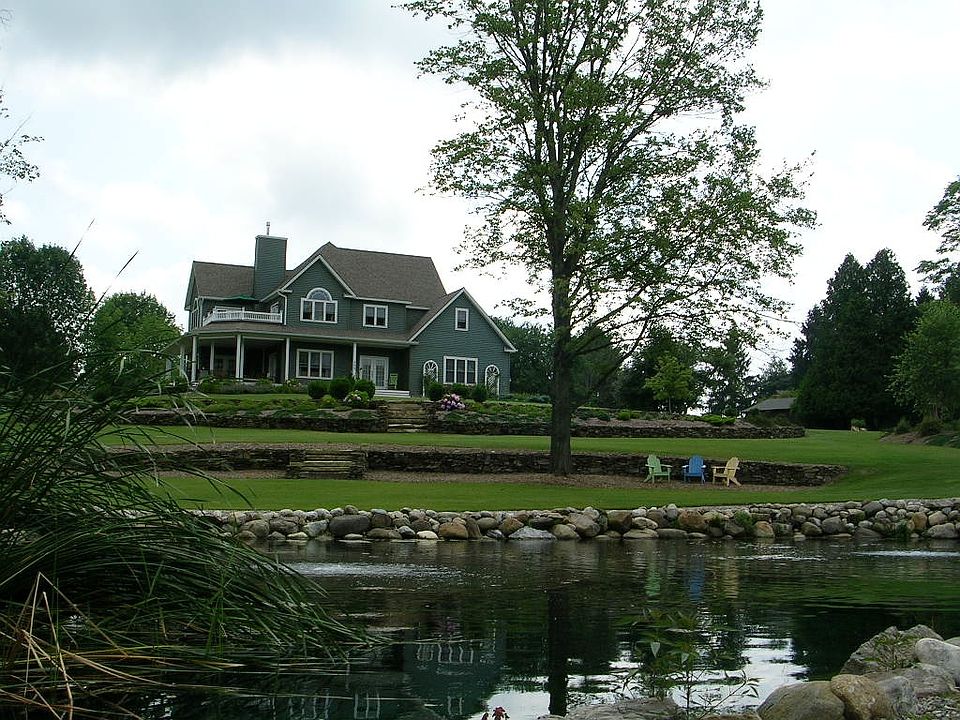 A picturesque pond welcomes you as you enter the long driveway leading up to the home. The main floor has mahogany hardwoods throughout most of the floor and includes the formal entry, kitchen/dinette, living room/formal dining, pantry/laundry room and sitting room. The kitchen features granite counter tops and a marble back splash. From the kitchen you may also enjoy your private back yard through the bay windows as you sit at either the dinette, which is comfortably positioned, or the dining island. The spacious living room/formal dining area has both crown molding, and a cultured stone gas fireplace. Going up to the second floor is an oak railing and stairway. The second floor includes the master suite, 3 guest bedrooms, an office space, and a full bath. Entering the master suite you immediately notice the vaulted ceiling and its own cultured stone fireplace. Follow the french doors to the private deck where you can take in beautiful sunsets with the western exposure. Attached by hall closets is a master bath, which includes both a double vanity, a jacuzzi, and an independent shower. On the outside of the home is an in ground sprinkler system, covered mahogany porches in the front and the back, and custom raised gardens. A great feature of this home is its full basement with multiple work areas and storage. It has an attached 2-car garage with easy access to the kitchen.