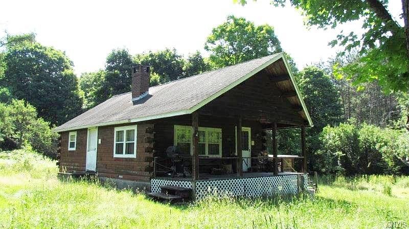 Well-maintained custom off-grid log cabin on 43 acres bordering NY State Land in Chenango County. Amazing property with planted trees, food plots and countless deer beds right up next to the cabin. On a seasonal road bordering Five Streams State Forest on two sides. GREAT hunting! The 24 x 30 log cabin has 3 bedrooms, a nice living room with a large fireplace, separate wood stove and an eat-in kitchen. Cleaver plumbing pumps water out of a shallow well into a holding tank then a portable on-demand hot water heater for showers/rinsing. Use the outhouse for bathroom. Propane runs the stove and refrigerator. Sits on a poured concrete pad. Partridge, turkey, ducks, and deer. Property also backs up to a large beaver pond. Hardwoods, fruit trees and food plots. AC and DC outlets.