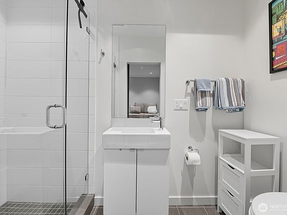 Tucked away from the street for added privacy,this fabulous townhome offers views of Mount Rainier,the Space Needle,and Olympic Mountain sunsets.The stunning chef’s kitchen features quartz countertops,oak cabinetry and a breakfast bar, perfect for everyday living and entertaining.The open-concept living and dining area enjoy a cozy gas fireplace and a private deck.Each of the 3 bedrooms includes its own en-suite bathroom, with two featuring heated floors.White oak hardwoods, refined built-ins, and museum-quality lighting add to the home's thoughtful design.Cap it all off with a large rooftop deck—ideal for entertaining or simply relaxing while taking in the city skyline.Prime location just steps from shops, cafés,grocery stores and parks.