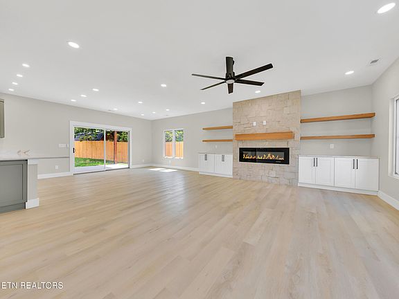 Step into this beautifully crafted new home, where every detail has been designed with style, convenience, and efficiency in mind. The heart of the home is a stunning kitchen featuring quartz countertops, abundant cabinetry, a spacious walk-in pantry, and a custom white oak range hood. The kitchen opens seamlessly to the living room which invites you to relax with a stone veneer electric fireplace, built-in cabinetry with matching quartz surfaces, white oak floating shelves, and charming bookshelves.