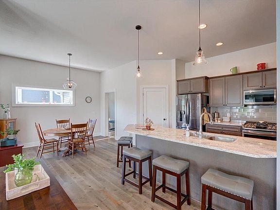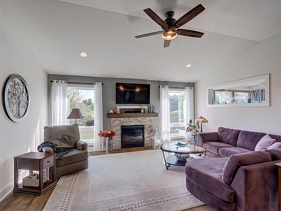 This home shines! Beautiful custom built ranch near wooded conservancy, ponds, park, biking/walking paths, and backing to a green space. Open floor plan with 12 ft ceilings, pantry & large granite kitchen island, & SS appliances. 1st floor laundry, basement with 2 egress windows and plumb in for bath. Primary with cathedral ceiling, walk in closet, and tiled bath with 2 granite sinks. The 3 season porch overlooks the beautiful fenced backyard with stamped concrete and Mississippi River rock patio and firepit. Over 25k in improvements including new front rail and steps, new front door, epoxied garage floor & new wood laminate in living rm.