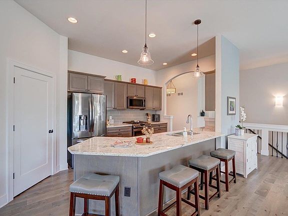 Epoxied garage floorMississippi river rock patioOpen floor planLarge granite kitchen islandPrimary with cathedral ceilingBeautiful fenced backyardWooded conservancy
