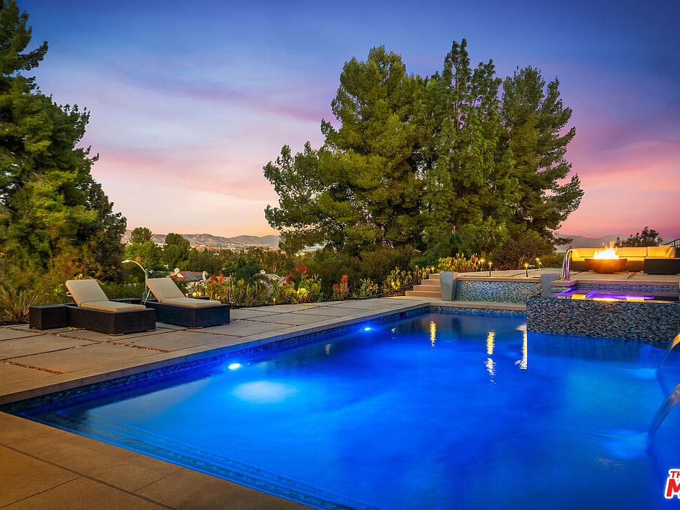 SOLD IN MULTIPLE OFFERS ABOVE ASKING! You'll fall in love with this stunning, prime West Hills pool home with spectacular Valley Views! Resting on almost 1/2 an acre (mostly flat), this light and bright gem features vaulted/smooth ceilings, recessed lights, 3 fireplaces, and wood floors. More practical highlights include roving security patrol, copper plumbing, central HVAC, 200 amp panel, 3 car garage, and fresh exterior paint. The layout is wonderful with an expansive living room, formal dining, sound studio (could be the 4th BR), office with a safe room, and kitchen that opens to a cozy den and private entertainer's backyard with a huge pool and spa. The considerable primary suite has a spa-like bathroom with dual sinks, a walk-in closet, and a separate shower and spa tub. It's also situated at the back of the house and has a sizeable balcony poised to take in the jaw-dropping views, particularly the multiple fireworks shows across the Valley. This showstopper is centrally located with convenient access to the Valley, beaches, and the 118, 405, and 101 freeways. It's also only minutes from the Woodland Hills Promenade, upscale restaurants, and shops.