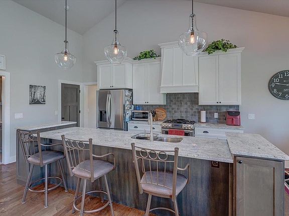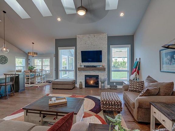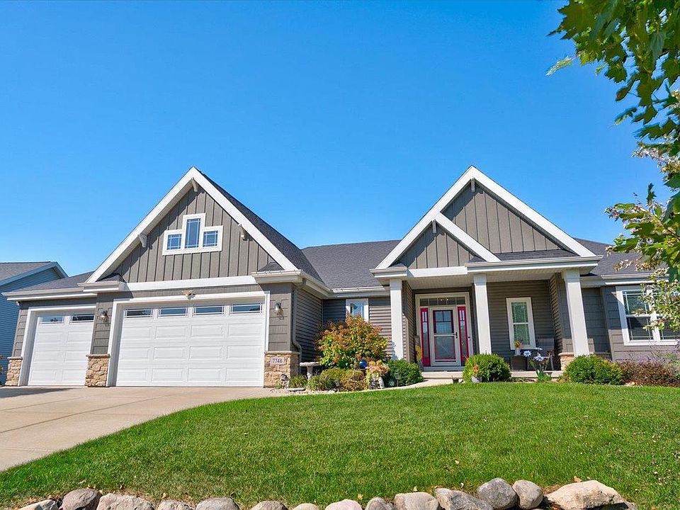 Stunning 4 bedroom Deforest ranch has everything you would expect from a high end property: open floor plan with 20 foot ceilings, main level gas fireplace, and skylights in liv rm & kitchen, 3 season porch leading to patio and firepit, granite island that can seat 4-5 comfortably, double convection oven, 1st floor tiled laundry with cubbies, access to basement from 3 car garage, Primary bedrm with tray ceiling, walk-in stone shower, dual granite sinks. Beautiful exposed basement rec rm with wet bar & full sized fridge, built-ins for TV w/ surrounding cabinetry, and office with pool table included. Over 30k of upgrades in past 6 years including front door, washer/dryer & skylights ('19), dishwasher ('23), fridge ('25), and backyard cedar fence.