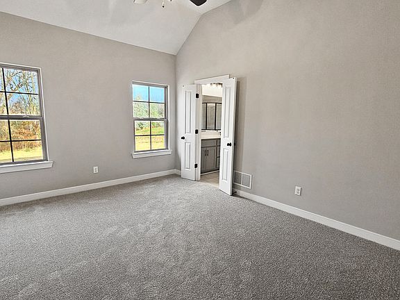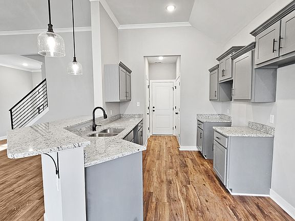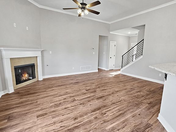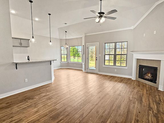Welcome to this newly constructed 4-bedroom, 3-bath home built in 2023. The open floor plan features a family-sized great room with a gas log fireplace, connecting seamlessly to the kitchen with granite countertops and a breakfast area with bar seating. The primary suite on the main floor includes a luxury bath with dual sinks, walk-in shower, jetted tub, and a spacious walk-in closet. Two additional bedrooms share a full bath downstairs, while the large fourth bedroom upstairs boasts a private full bath and walk-in closet. Enjoy outdoor living on the covered patio overlooking the backyard with views of the neighborhood lake. Modern luxury and comfort await in this stylish home. Ask about builder bonus.
