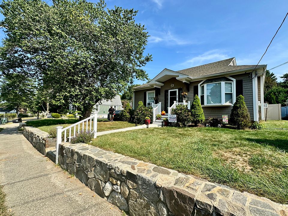 Beautifully cared for home and its first time to market! Expanded Cape with stone wall in front with walkway, the most amazing level backyard with fire pit, luscious grass, mature plantings, patio, large deck. Entry foyer with hardwood floor, large, sunlit living room with built-in cabinetry, large windows. Formal dining room with window seat, stunning kitchen, granite counters, tile backslash, stainless appliances, gas five unit stove, coffee bar and wine rack. Desk, and plenty of under-lit light wood cabinetry. Family room/den off the kitchen area with a large sliding door leading to the huge deck overlooking the beautiful backyard, sunny area for a garden for Spring of 2025. Two bedrooms on the first floor, full bath with a specialty shower system, W/D on first floor, there is also hookups in the large basement for W/D also. Second floor is its own private space with a bedroom, full bath, storage area. Basement has a basement system in it, two sunk pumps, 200 amp service, the house has a solar system panel installed on the roof, saving money on electricity each month. One car garage, paved driveway, side door to kitchen from the driveway for easy access after grocery shopping. Sandy Walnut Beach is half mile away, shopping, easy access to major highways, medical facilities, Milford or Stratford Train Stations. This home has been loved. Sold As Is, Inspections for informational purposes only.