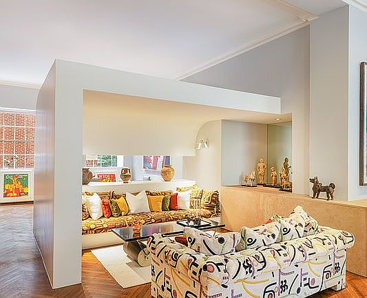 The custom-designed, sculptural alcove sitting area creates a seamless transition between the grand living room and the formal dining area which with impressive gallery walls perfect for showcasing art, is ideally located next to the large modern eat in kitchen.