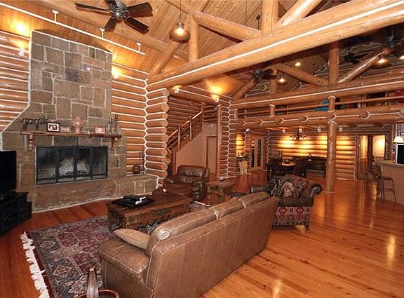 Authentic Montana style log home on 40 scenic acres near Lake Ray Roberts. This magnificent, beautifully maintained home sits in a secluded hill top setting surrounded by grand-daddy oak trees and a private, resort like environment. Its spacious open floor-plan is enhanced with massive log beams, a great room with a large rock fireplace plus wood & slate floors. Ideal for family & fun, the home can sleep 12 or more with 3 bedrooms plus a huge upstairs bunk room with 8 built in log bunk beds. There's also a basketball court styled game room. Outside adventure awaits with a captivating rock fire pit, kids playground and plenty of room to roam with a gentle slope down to a large fenced pasture & pond.