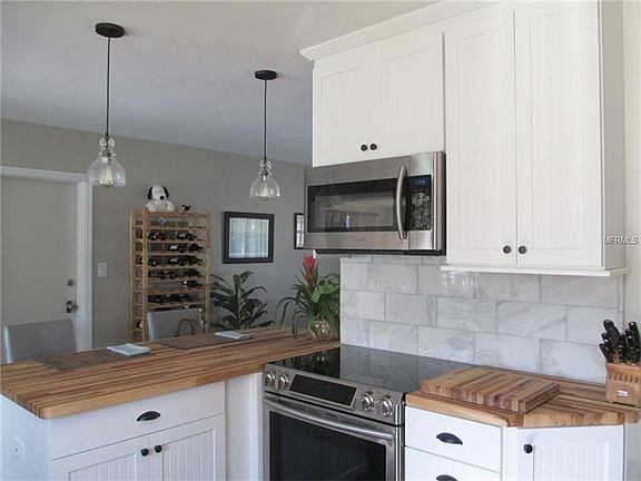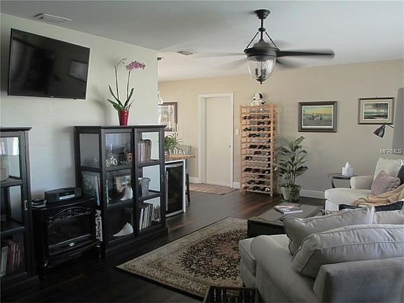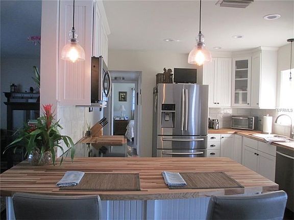 Like New, Renovated Lake Front Dunedin Home! This property is located directly on beautiful and serene Lake Sperry just minutes to festive downtown Dunedin, Pinellas Trail, Honeymoon Island and so much more. Complete with a new Gourmet kitchen including butcher block counter tops, marble backsplash, breakfast bar with built in wine cooler, cabinets and top of the line Samsung appliances. Nucore cork blacked laminate waterproof floors in living room, 2nd bedroom, kitchen & Florida room. The master bedroom and bathroom features Italian tile flooring. The electric panel has been replaced along with all the lighting fixtures, baseboards and has been freshly painted. The bathroom has a Jacuzzi style tub with shower, newer commode, vanity and lighting. Enjoy the water birds or the fish jumping from your backyard and patio also views from the Florida room, breakfast bar, kitchen window and master bedroom. Above ground pool will removed by seller, at buyers request.