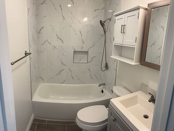The bathroom is located in the hallway and features a shower/tub combination, a sink with a vanity.