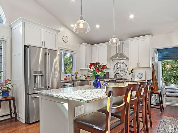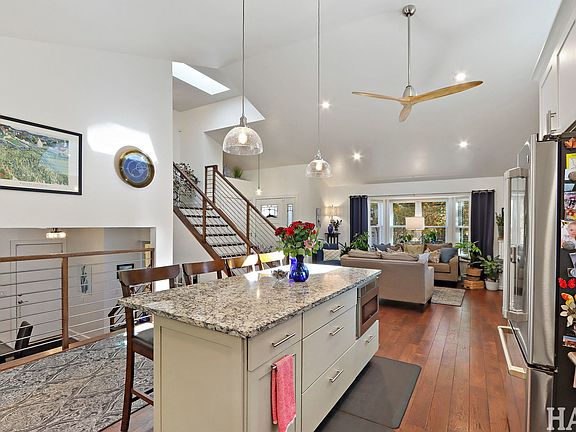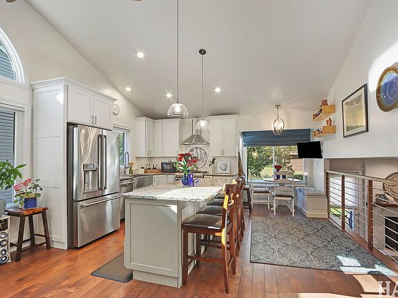 Welcome to a one-of-a-kind retreat where thoughtful design, natural beauty, and everyday comfort come together in perfect harmony. This fully renovated, sun-drenched home features soaring vaulted ceilings, dramatic walnut hardwood floors, and a custom open staircase with horizontal stainless-steel railings that set a striking tone from the moment you walk in. The chef's kitchen is the heart of the home, offering GE Cafe stainless steel appliances including a double oven range and in-drawer microwave, 42" soft-close Quaker cabinets, and a generous eat-in island with sweeping 270 views of the lush gardens. Enjoy cozy mornings in the built-in breakfast nook, and warm evenings in the dining room with its wood-burning fireplace, gas starter, and ceramic logs. The 2020 addition adds a rustic yet refined four-seasons room or home office wrapped in whitewashed shiplap and framed by six oversized windows plus a wrought-iron fireplace for year-round enjoyment. Upstairs, the primary suite boasts vaulted ceilings, a spa-like bath with freestanding soaking tub, separate glass shower, and a large walk-in closet, while two additional bedrooms and a full hall bath with designer walk-in shower provide space and style. A dedicated laundry closet with stacked LG washer/dryer adds convenience. The lower-level studio is ideal for guests or multi-generational living, complete with a Murphy bed, garden tub with shower, ample closet space, and its own full bath. Outside, you'll find two stunning cherry trees, curated perennial landscaping, and flagstone and brick patios with a built-in fire pit and BBQ area-perfect for entertaining or enjoying quiet moments under the stars. Back gate access leads directly to the neighborhood park, making this home's setting as functional as it is serene. Renovated in 2017 with triple-pane Pella windows, new furnace, AC, and updated mechanicals throughout, this home is move-in ready and deeply loved. Truly unlike anything else on the market, this home balances modern upgrades with an unmistakable sense of heart and soul.
