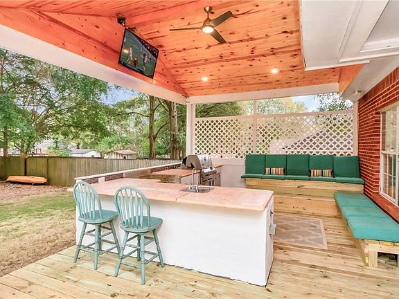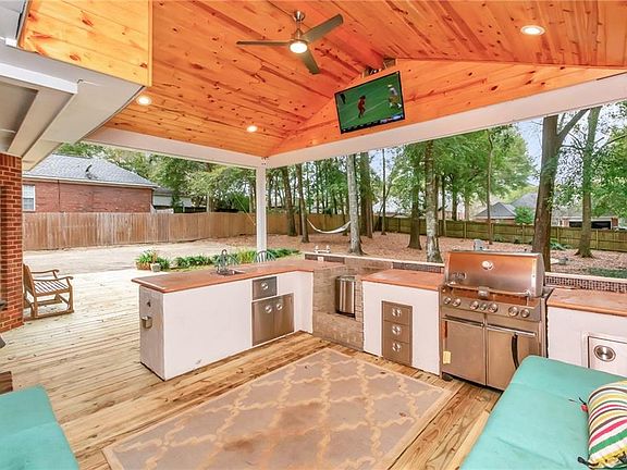 Nice Brick Home On Cul De Sac In Beautiful Windtree Subdivision. 4 Br 2 1/2 Baths,. New roof. Large Family With 19', yes 19' ceilings, a Fireplace and loft. Large outdoor patio living space with new deck and new fully covered and attached outdoor kitchen, with concrete countertops, sink, lights, fan, seating and TV, Overlooking Large Backyard With Shady Trees. Fire pit sitting area and storage shed. Double Garage with new door. Tons of floored storage space. Low utility bills. Renovated eat in kitchen with bamboo countertops. Upgraded appliances and fixtures. Large laundry room. House is move in ready.