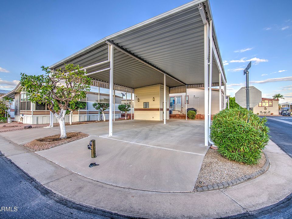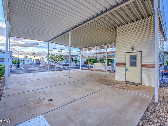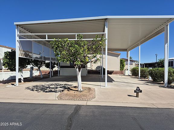 This is a great western facing oversized corner lot in Carriage Manor Resort, an active 55+ adult community where you OWN THE LAND! This whole lot is covered by a metal roof and has plenty of fruit trees for your nutritional enjoyment. Carriage Manor has 24/7 onsite security, a heated saltwater pool/spa, fitness facility, Tennis, Pickle ball, Golf Club, Onsite heated pool/spa, nice fitness facility, Tennis, Pickle ball, Golf Club, Billiards, Lapidary/Silversmith, Sewing, Wood shop, Bingo, Dances parties & many more activities & amenities.