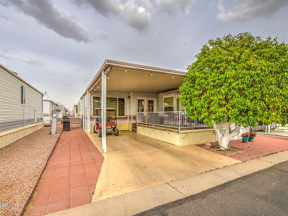 You have to see this beautiful Park Model with an Arizona Room in Carriage Manor Resort, a premier 55+ Community where you OWN THE LAND! Sit on the large deck and enjoy the nice grapefruit tree as you watch the sunset. This home has a newer stove, fridge and microwave. The roof was redone in 2021 and this home has dual pane windows. It also has a walk in shower in the main bathroom as well as an additional 1/2 bath off the AZ Room. The back yard is fenced in and is gated on both sides. Carriage Manor has 24/7 on site security, a heated saltwater pool/spa, fitness facility, Tennis, Pickle ball, Golf Club, Onsite heated pool/spa, nice fitness facility, Tennis, Pickle ball, Golf Club, Billiards, Lapidary/Silversmith, Sewing, Wood shop, Bingo, Dances parties & many more activities & amenities