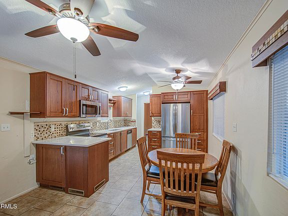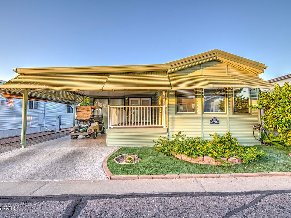 This is a beautiful south facing home that was recently painted in Carriage Manor Resort, an active 55+ adult community where you OWN THE LAND! Ikea cabinets in the kitchen, glass top stove, quartz counter tops, stainless appliances, 16'' tiled kitchen, dual pane windows, insulation under the AZ room, gorgeous laminate floors, foam roof, tiled deck with misting system, dwarf sweet naval orange tree in front and the list goes on and on. This home is a must see!! Carriage Manor has 24/7 onsite security, a heated saltwater pool/spa, fitness facility, Tennis, Pickle ball, Golf Club, Billiards, Lapidary/Silversmith, Sewing, Wood shop, Bingo, Dances parties & many more activities & amenities.
