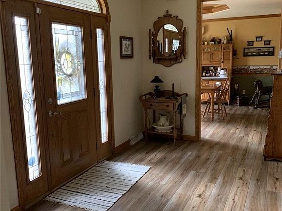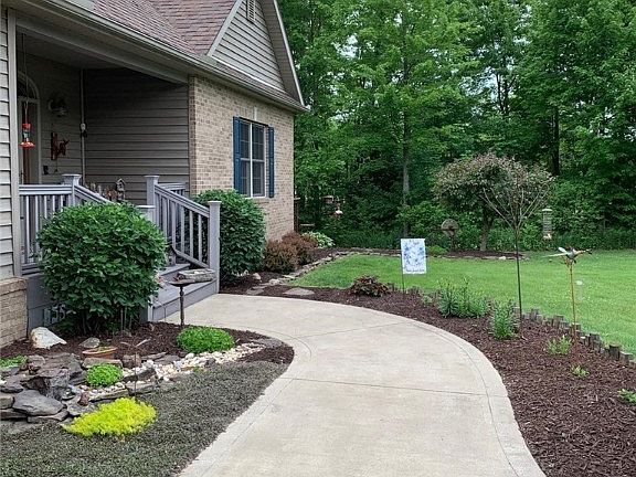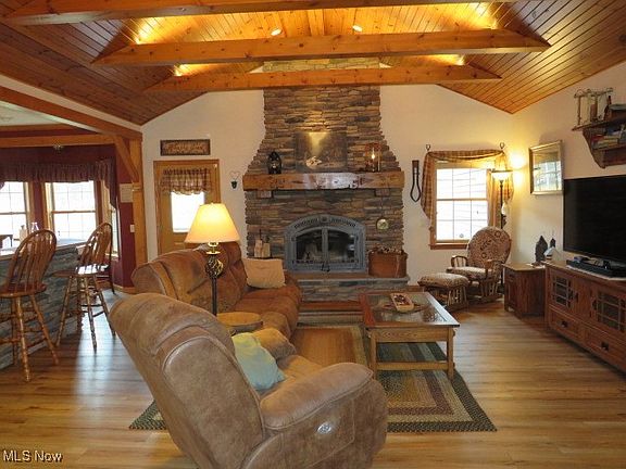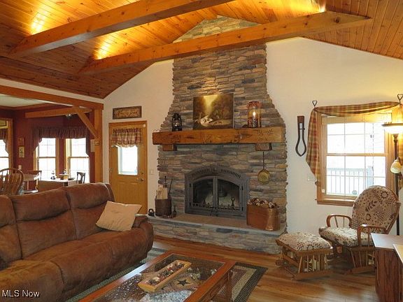 Spring is here and so is this meticulously built and maintained 4 bedroom, 3 bath home. Your guests will feel welcomed when they walk through the front door into the large foyer. The vaulted living room is spacious and loaded with character. The wood beamed ceiling leads you to the beautiful stone woodburning fireplace that boasts a hand carved chestnut mantle. The well-appointed kitchen has oak cabinetry and a solid surface counter that offers plenty of space for cooking and entertaining. Enjoy a formal dining room with a tasteful lighted tray ceiling. The master suite is a dream come true! A spacious bedroom leads to two walk-in closets, his and her sinks, a makeup vanity, walk in shower and soaking tub that will be sure to please. Coming in through the garage you will find a large, useful laundry room with storage closet. A cheerful second bedroom and full bath also grace the main floor. Downstairs in the walk out basement, you will find it finished with two large bedrooms, full bath, an expansive family room, bar of your dreams and separate game room. Need storage? Look no further. There are two extra-large shelving areas for all your items. With a 2-car garage and heated attached 3rd bay work area you’ll have plenty of space to maintain your vehicles. Step out back and enjoy a huge partially covered deck. All this sits on a 1.63 acre corner lot with beautiful landscaping. This house is 2 x 6 construction throughout with 9’ ceilings, Krafmaid cabinetry, trex decking, 48-gallon industrial hot water tank, LVP flooring, pull down attic stairs in the garage for more storage, solid core doors/pocket doors and oak trim, custom blinds, in-ground dog fence, heavy duty storm doors, 200 amp service and the list goes on! Minutes from I-90 and Northeast Ohio’s winery Grand River Valley-Make your appointment today and entertain for a lifetime in your new home!