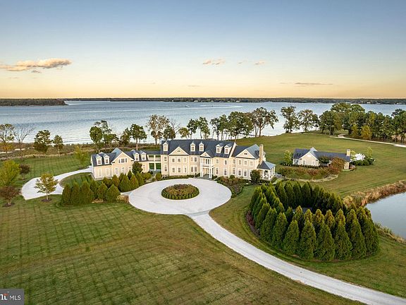 Arguably one of the most important new builds on the Eastern Shore, 7751 Rollyston Drive is a 91-acre estate on two parcels with 1500 feet of shoreline along a wide stretch of the beautiful Miles River. This turnkey property, just outside the town of St. Michaels, was completed in 2016. Prioritizing waterfront views, outdoor living spaces and comfortable living as well as for entertaining guests, the stately main house is accessed by a private, pea gravel road bordered by a pond with two gazebos and lighted fountains. The graceful circular driveway can accommodate multiple vehicles and leads to the rear entrance of the 4-car garage. The main residence with 12’ to 14’ ceilings offers 9 bedrooms with ensuite baths and 4 half baths. Accessible from the second floor of the main house as well as the garage, a stand-alone apartment showcases a great room with cathedral ceiling, pool table and game table with refreshment center, sound system, bedroom, and 1 ½ baths. Two outdoor porches are perfect for dining and entertaining and a porch off the second floor Primary Suite offers spectacular river views. Built by a prominent DC builder for his own personal use, the structure of the house is truly commercial- grade and no detail was spared. All carpentry and flooring were custom designed and built with unparalleled craftsmanship, as evidenced by the moldings, staircases, and woodwork throughout the residence. Baths are Waterworks with marble tops and hardware is Baldwin Satin nickel. Media, HVAC, outdoor lighting, and security systems are controlled remotely through apps. Designed with an eye to entertaining there is a room for every occasion: a large eat-in Gourmet kitchen with granite countertops and Wolf/Sub-Zero appliances; a formal dining room that comfortably seats 14, two offices, a cozy family room with adjacent bar and living room, and a main level full bedroom with ensuite bath. Additionally, there is a Media room with 12 theater chairs, full bar, spa room and a large multi-purpose room in the lower level. Outdoors, a flagstone path leads from the southern side porch to a heated salt-water pool, pool house with two full baths, a covered outdoor kitchen and dining area with Wolf/Sub Zero appliances, and a 100” pier. The property houses a climate-controlled barn with plumbing, potential for 10 horse stalls and a second- floor hay loft or, the entire structure can become a car collector’s paradise. Next to the barn is a paddock and further down a service road is a cleared area for a future tennis/sport court. The caretaker’s house at the entry to the private drive has two levels, front and rear porches, three bedrooms, three and one-half baths and a two-car garage with two outdoor spaces. When the current owners built the property, the expansive view of the Miles River became the focal point of the interior public rooms and now provides exquisite sunrise views. The partially rip-rapped shoreline has a small beach accessible by canoe, kayak, or shallow water boat. Co-Lister includes Cynthia Howar.