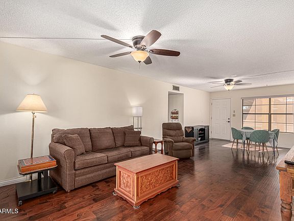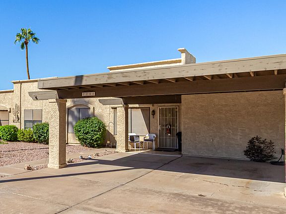 Welcome to Fountain of the Sun, a premier 55+ gated community where resort-style living meets everyday comfort! This beautifully updated 2-bedroom, 2 bath home offers a desirable split floor plan with a spacious great room. Wood-look laminate floors flow through the living spaces and bedrooms, while tile accents the kitchen and baths, perfect for entertaining. The remodeled kitchen is a true highlight, featuring designer shaker cabinets, granite countertops, and upgraded stainless-steel appliances, including the refrigerator. Step outside to your private covered patio with tile flooring and mature landscaping, the ideal spot for morning coffee or evening gatherings with friends and neighbors. A full-size laundry room and two covered parking spaces add everyday ease to this inviting home. Step outside your door and enjoy a wealth of amenities, play a round on the community golf course, relax in the heated pool or spa, stay active in the fitness center or join neighbors for bingo nights and social events at the clubhouse. With 24-hour gated security you can relax and enjoy the best of active adult living at an incredible value. Landscaping maintenance is taken care of for you, allowing you to enjoy a beautifully maintained environment without the hassle. Conveniently located near shopping, dining, parks, and medical facilities, this condo offers comfort, privacy, and a prime location in an active, vibrant community