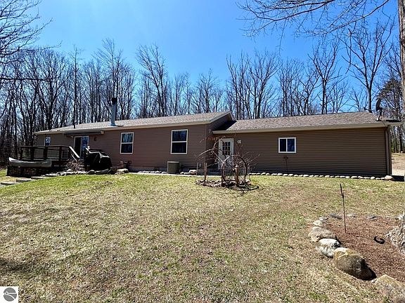 Privacy and seclusion await at this true Up North retreat! This 3 bedroom, 2 bath ranch is nestled on over 10 wooded acres and backs up to more than 15,000 acres of state land, offering endless outdoor adventure. The property features scenic trails winding through mature hardwoods. Features an updated kitchen with stainless steel appliances and granite countertops, and a cozy living room with a stone fireplace and serene backyard views. The home also includes an attached, insulated 30x24 garage, a 12x20 storage shed, a 16x10 wood shed, and a fully fenced 24x16 garden area? Perfect for growing your own vegetables. Located just a few miles from the prestigious Forest Dunes Golf Course and close to the Mason Tract for unbridled trout fishing. Peace, privacy, and nature all in one package!